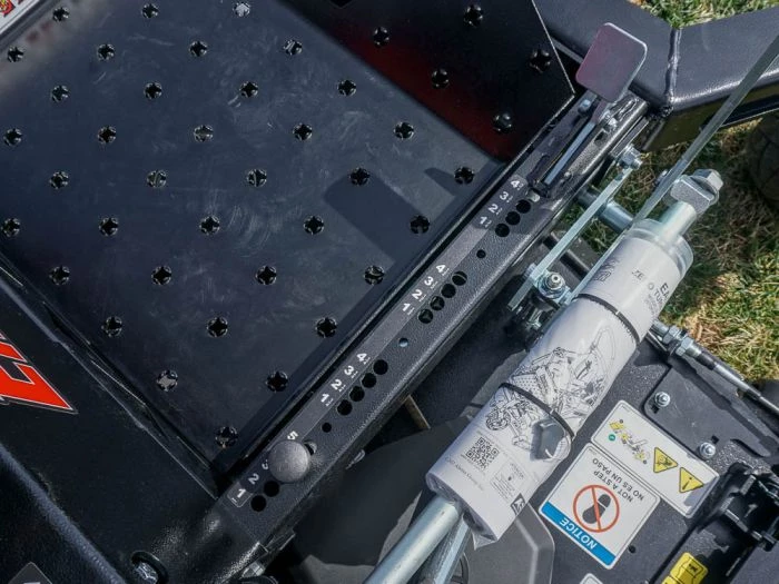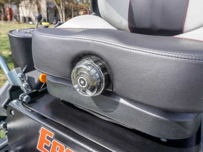 - High-back suspension seat, lumbar support and recline, padded armrest, and ISO mounted platform