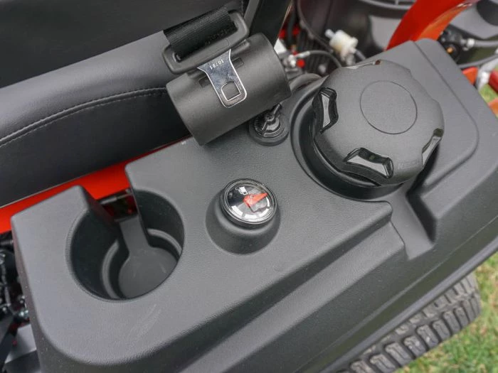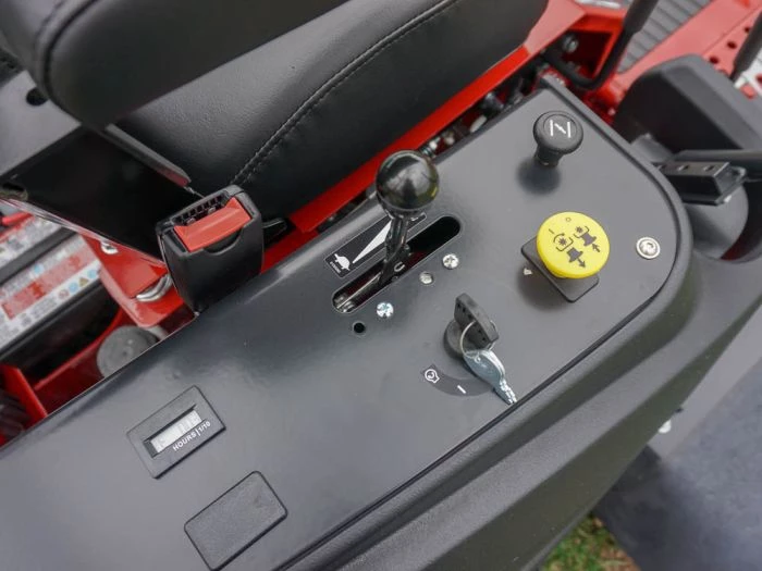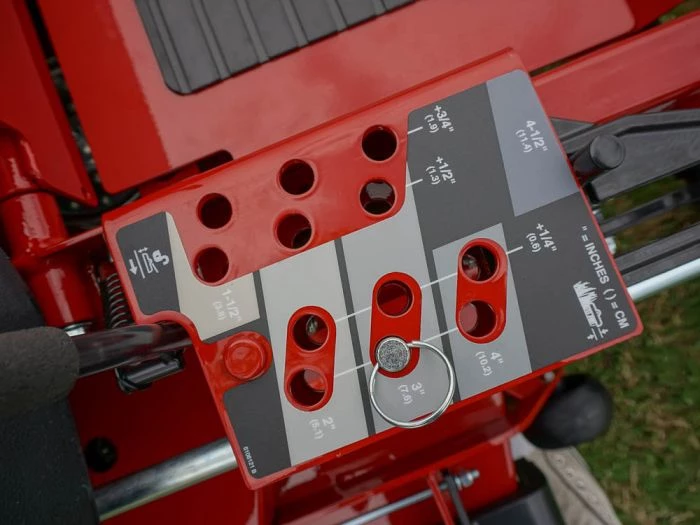 - Foot-operated deck lift with adjustable pedal for cutting heights between 1.5″-4.5″