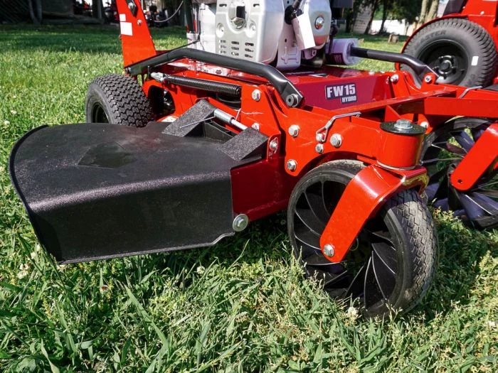 - Thick steel guards protect the front deck mower’s transmission when going over curbs or rolling on and off a trailer