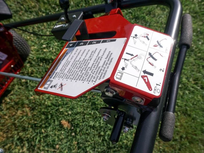 - One hand operation control. Adjust the mower’s speed without removing your hands from the control handles with the improved, ready-access cruise control bar and convenient speed indicator