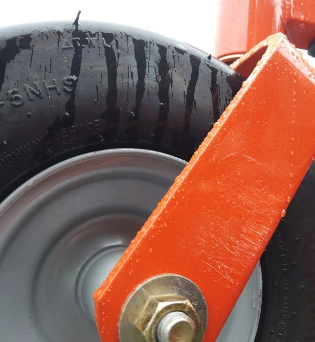 - 6-inch wide caster wheels with pneumatic tires are easy on turf and provide long life