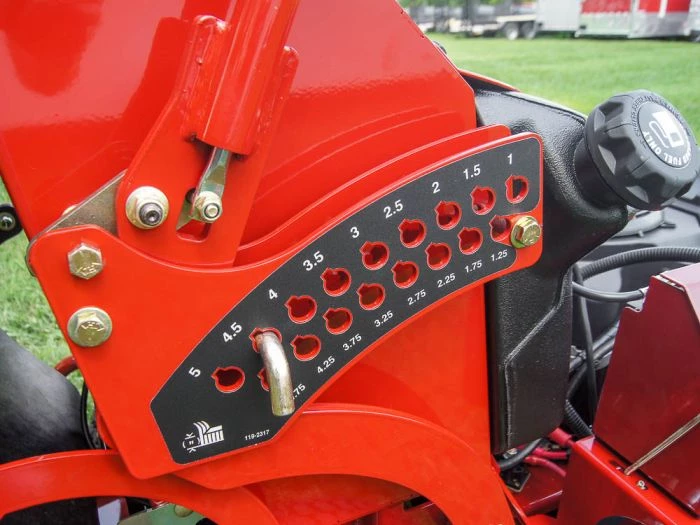 - Rubber discharge chute for close trimming without damaging chute or landscape structures